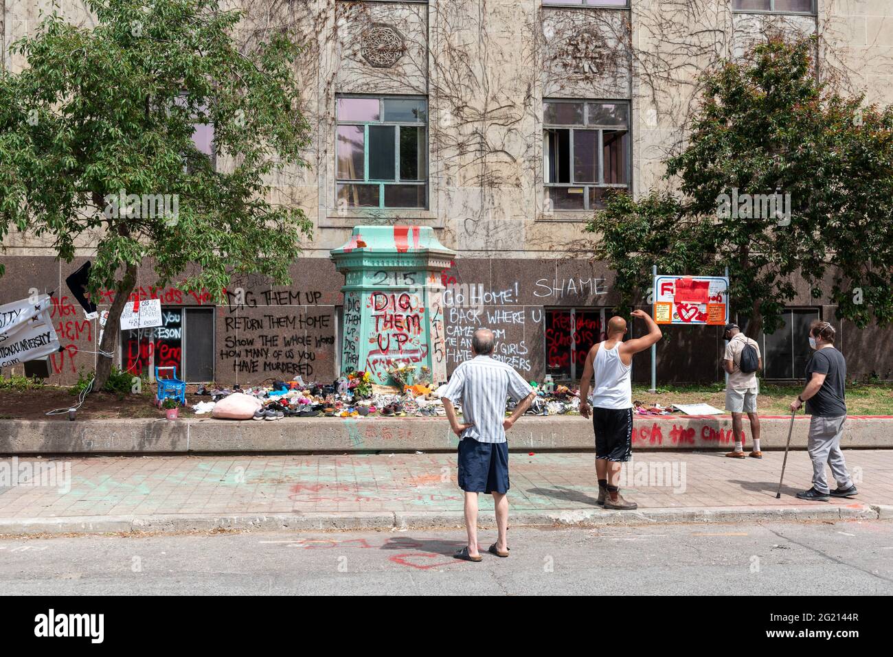 On june 6, the statue was toppled, decapitated and thrown into toronto harbour;